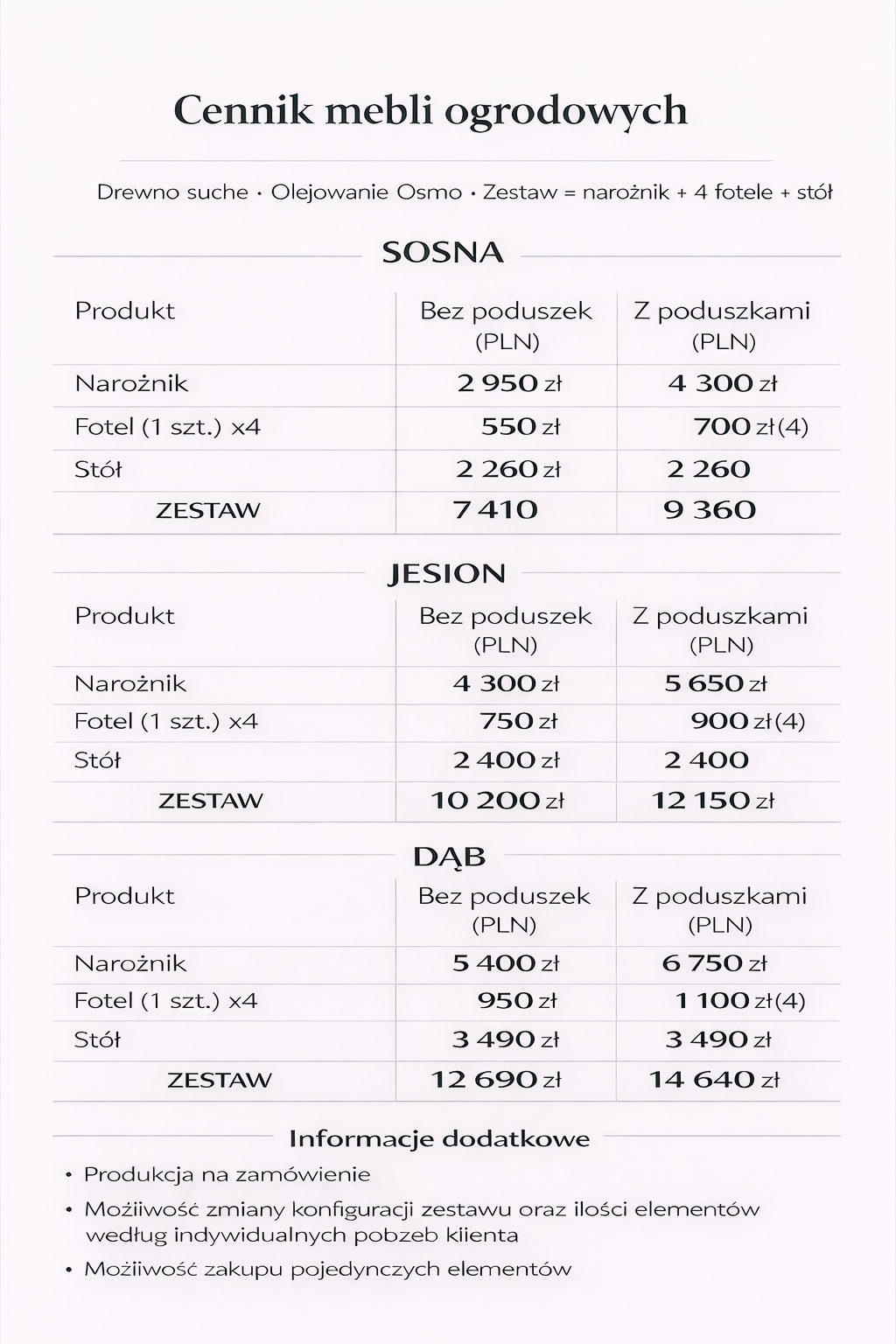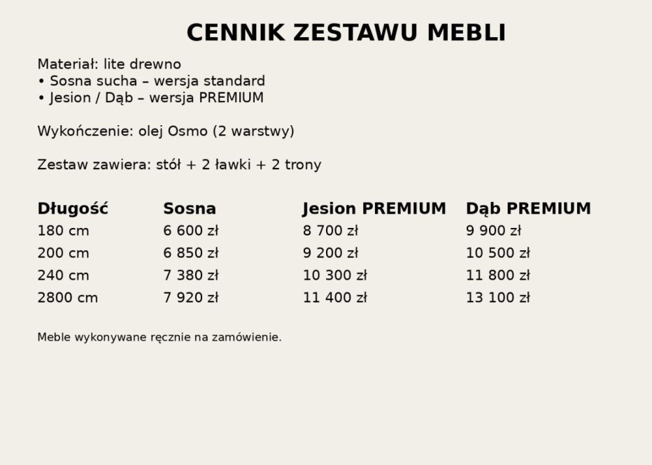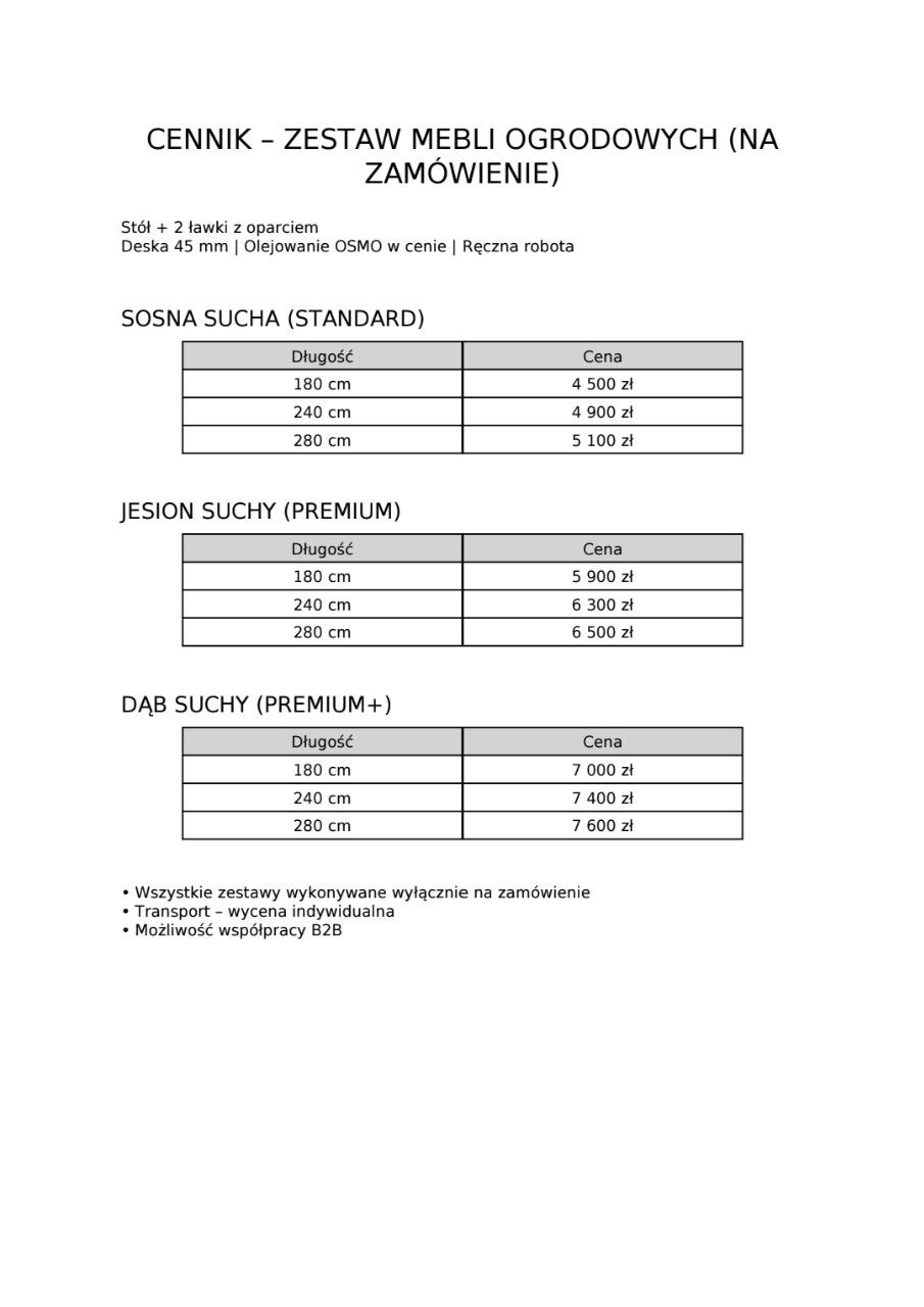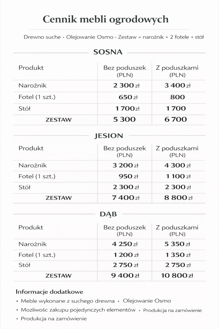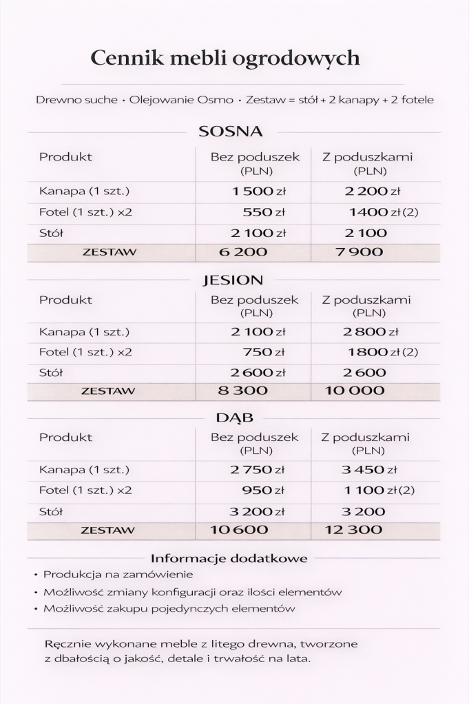 Każdy zestaw wykonywany jest na zamówienie, z możliwością dopasowania wymiarów, konfiguracji oraz liczby elementów do potrzeb klienta