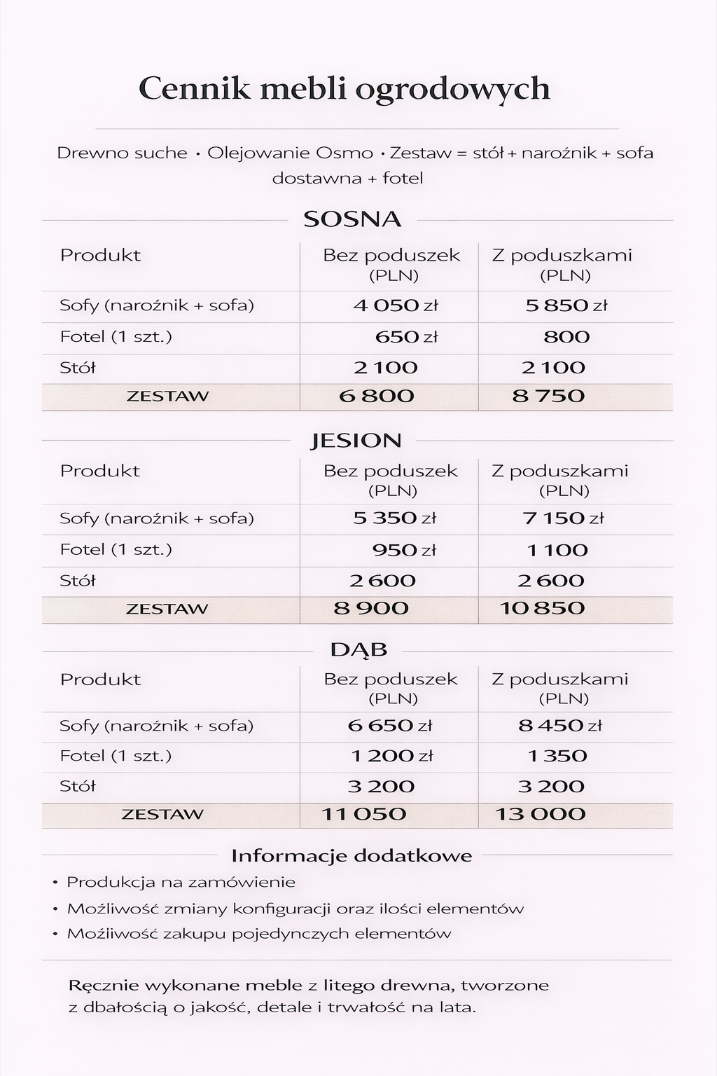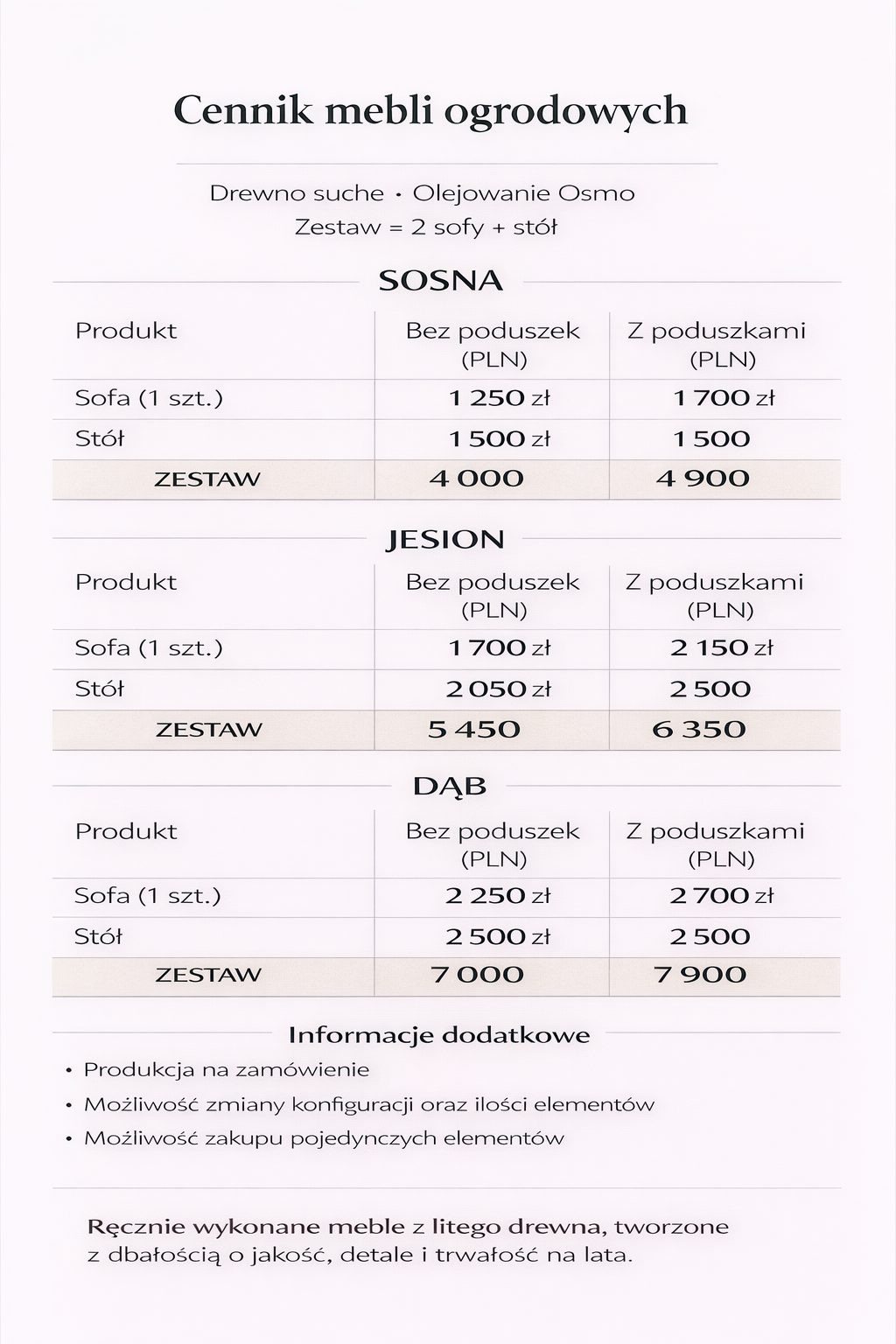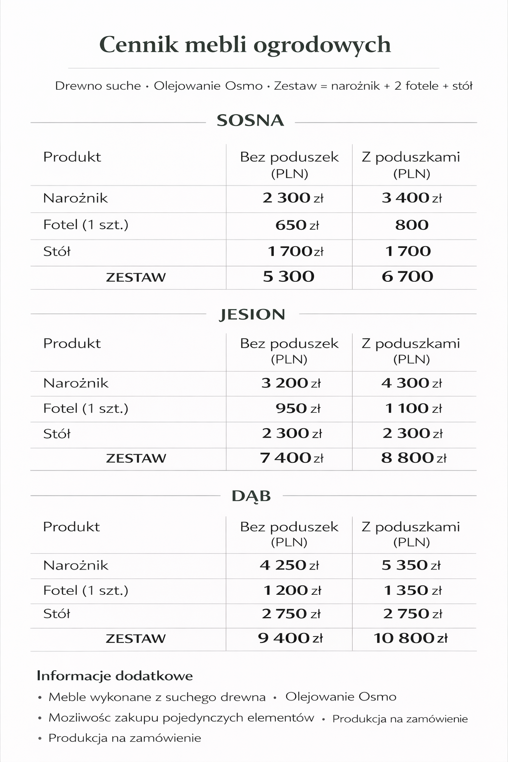 Każdy zestaw wykonywany jest na zamówienie, z możliwością dopasowania wymiarów, konfiguracji oraz liczby elementów do potrzeb klienta